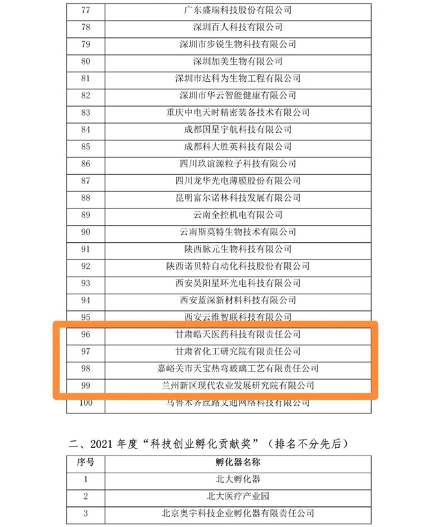 2021年度“中國(guó)技術(shù)創(chuàng)業(yè)協(xié)會(huì)科技創(chuàng)業(yè)貢獻(xiàn)獎(jiǎng)”評(píng)審結(jié)果日前正式公布,甘肅八家企業(yè)單位分別榮獲2021年度“科技創(chuàng)業(yè)孵化貢獻(xiàn)獎(jiǎng)”和2021年度“科學(xué)創(chuàng)新貢獻(xiàn)獎(jiǎng)”。